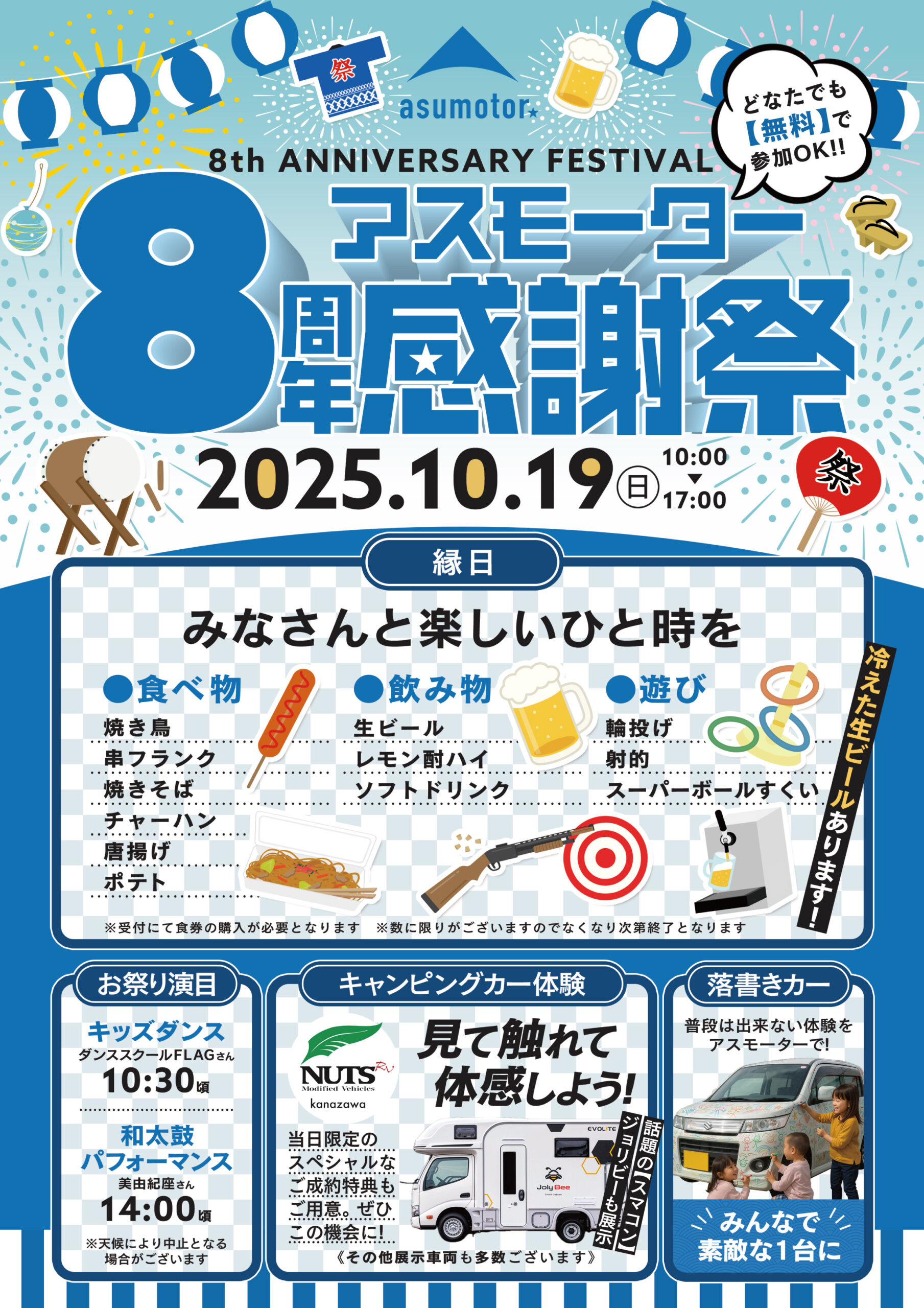 株式会社アスモーターは、創業8周年を記念して、2025年10月19日(日)に「感謝祭」を開催いたします。